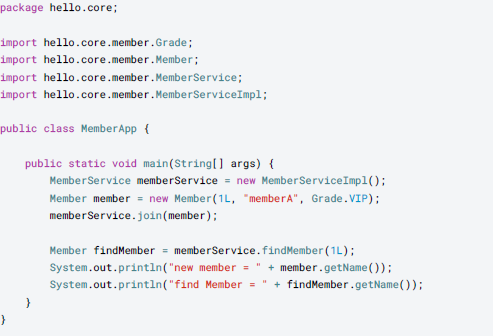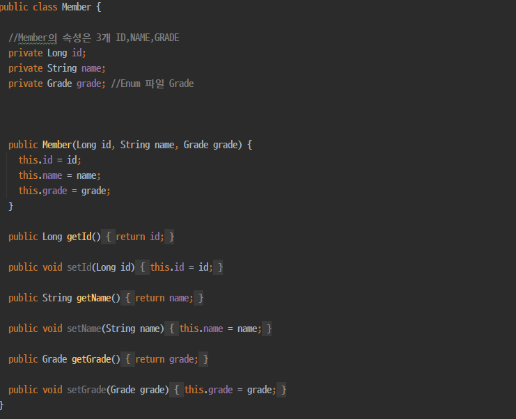 또한 Member 생성자를 사용하여 기본적으로 Member 객체를 생성시 id/name/grade 속성을 가질 수 있도록 합니다.