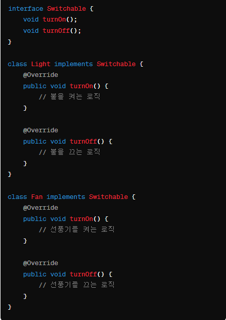이 예시를 보면. 추상화인 Switchable 인터페이스에 의존하고 있는 Light , Fan 클래스를 볼 수 있습니다.
