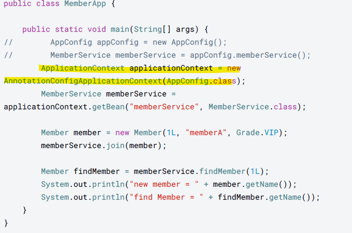 ApplicationContext applicationContext = new AnnotationConfigApplicationContext(AppConfig.class); 를 붙여줍니다.
