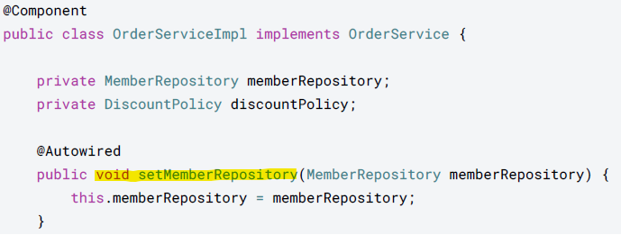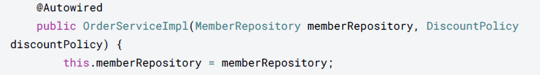 그 이유는 memberRepository., discountPolicy 모두 의존관계 주입이 누락되었기 때문이다.