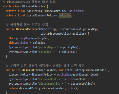 만약 discount의 discountCode로 fixDiscountPolicy가 넘어오면 fixDiscountPolicy 빈을 찾아 반환한다.