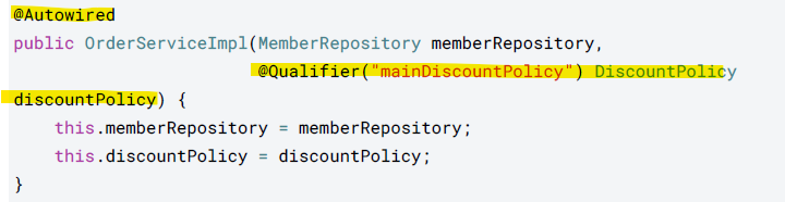 그리고 마지막으로 생성자에 적용할 때는, 파라미터 부분에 < @Qualiier("구분자") 파라미터 > 로 해주면 된다.