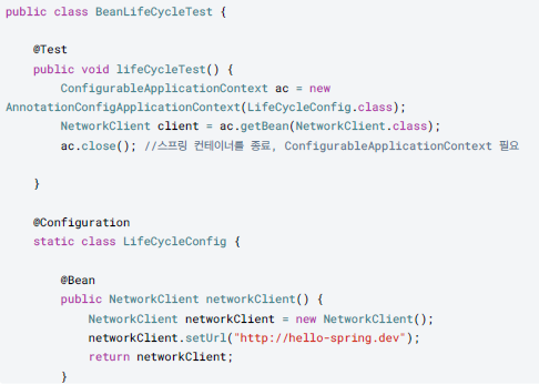 그리고 lifeCycleTest()내에 NetworkClient 객체인 client에 빈 정보를 심어 테스트를 한 후