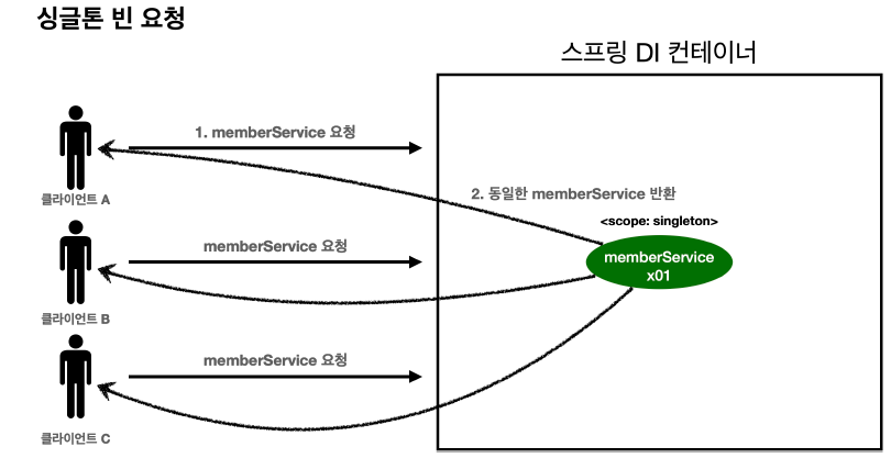 싱글톤 스코프의 빈은 각기 다른 클라이언트에게 요청이 와도 같은 객체 인스턴스의 스프링 빈을 반환한다.