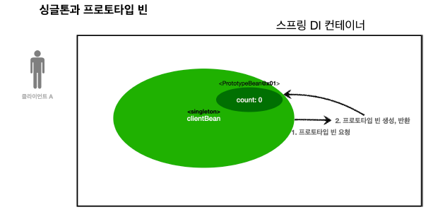 (프로토타입 빈이라고 해서 사용할때마다 새로 생성되는건 X, 주입 시점에 컨테이너에 요청되어서 생성되는 것)