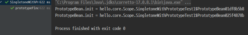 getObject()를 통해 항상 새로운 프로토타입 빈이 생성되는 것을 확인할 수 있다.