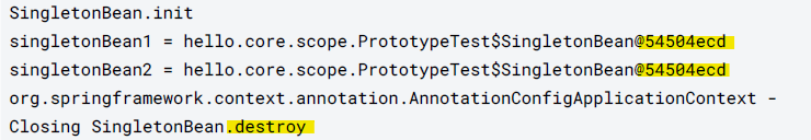빈 초기화 메서드 실행 후 싱글톤이므로 같은 객체가 반환되고 종료 메서드까지 정상적으로 호출됨을 확인했다.
