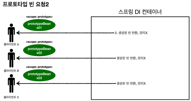 이후에도 컨테이너에 같은 요청이 오면 항상 "새로운" 프로토타입 빈은 생성/반환한다.