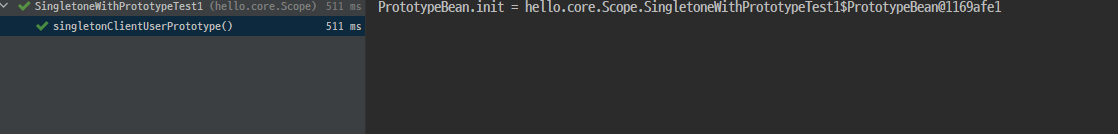 이번엔 싱글톤 빈에다가 프로토타입 빈을 심는(내부 필드에 보관하는) 방법이다.
