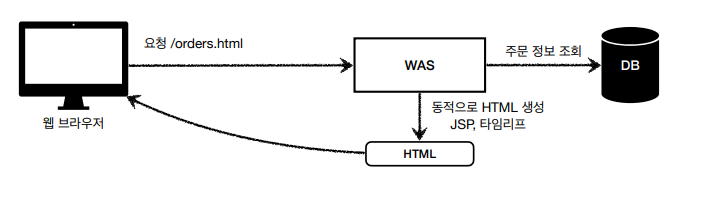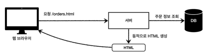 웹 브라우저에서 요청이오면, 서버에서 DB를 조회하고 JSP나 타임리프을 이용하여 동적으로 HTML을 생성해서