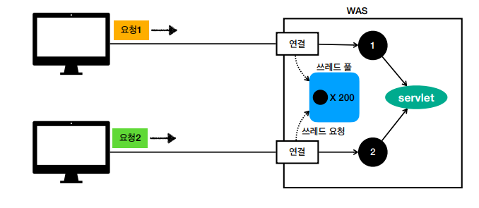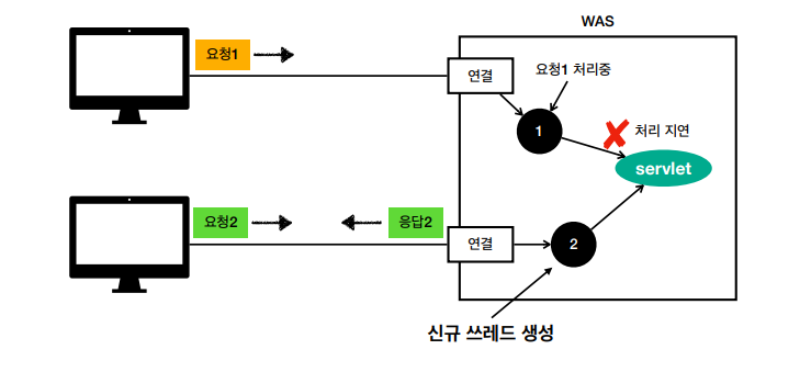만약 그 쓰레드가 하나라면, WAS에서 서블릿을 호출할 대상도 하나이고,