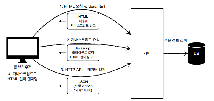 만약 주문과 관련된 앱이라면, 먼저 웹 브라우저에서 서버로 HTML을 요청합니다.