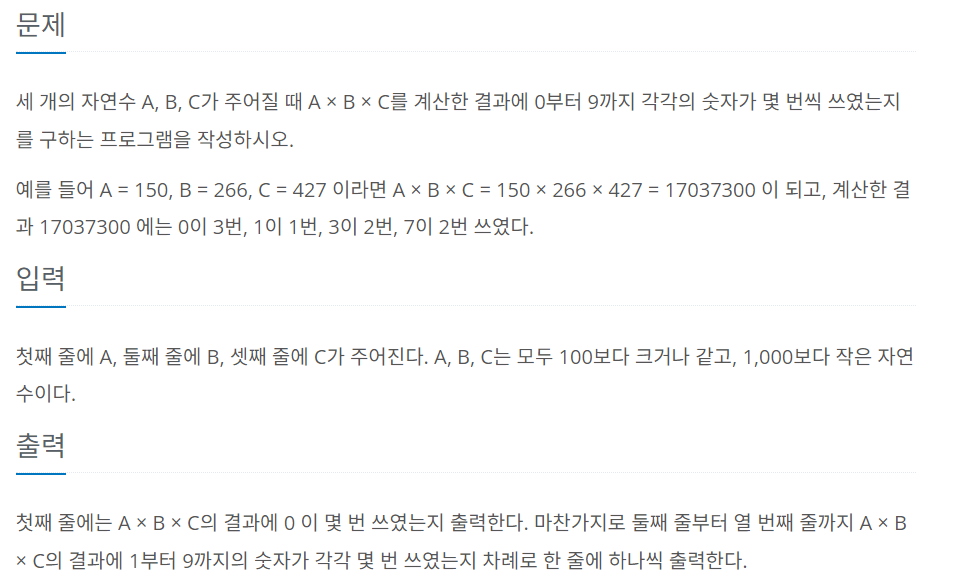 2. 각 숫자를 곱하고 결과값에서 사용된 수 (0~9)의 개수를 한 줄씩 출력합니다.