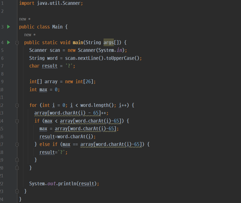 변환하는 과정이 필요합니다. 대문자 또는 소문자로 변환한 후, 문자열을 순회하며 사용된 알파벳의 개수를 배열에 저장하고 가장 많이 카운트된 알파벳을 대문자로 출력합니다. 만약 가장 많이 카운트도니 알파벳이 2개 이상이라면 문자열 '?'을 출력합니다.