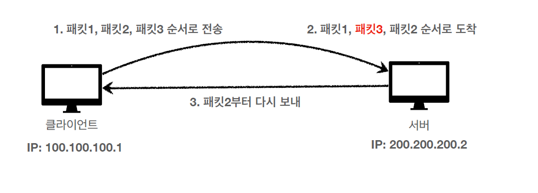 서버에서 클라이언트로 순서가 잘못된 부분부터 다시 보내라고 요청을 한다.