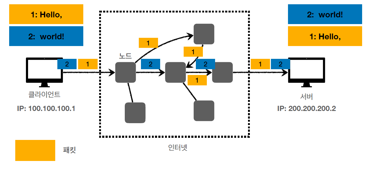 "HELLO"와 "WORLD!"로 쪼갠 상황이다. 이렇게 쪼갠 데이터를 각각 패킷으로 감싸고 서버로 전송했는데