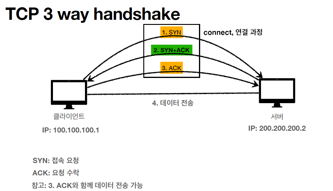 서버 (SYN+ACK): 응, 지금 연결해도 돼 ! (ACK) 나도 너한테 연결해도 되니? (SYN)